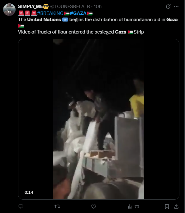 Το Ισραήλ είχε προηγουμένως ανακοινώσει την είσοδο φορτηγών ανθρωπιστικής βοήθειας του ΟΗΕ - φορτωμένων με αλεύρι, παιδικές τροφές, ιατρικά εφόδια και άλλα είδη πρώτης ανάγκης - ωστόσο κανένα από αυτά τα εφόδια δεν είχε αποχωρήσει από τη ζώνη φόρτωσης στο πέρασμα Kerem Shalom, όπου πρέπει να επαναφορτωθούν σε άλλα φορτηγά εντός της Λωρίδας της Γάζας.