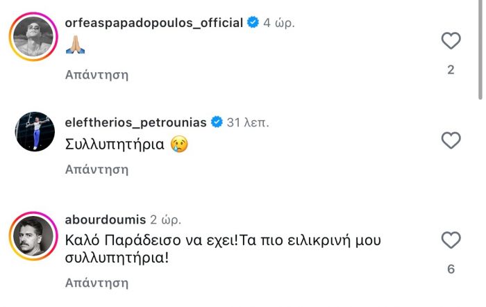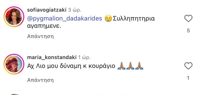 Η είδηση ότι η μητέρα του Πυγμαλίωνα Δαδακαρίδη έφυγε από τη ζωή έκανε αμέσως και τους θαυμαστές του αλλά και πολλούς συναδέλφους του -και όχι μόνο-να τον συλλυπηθούν και να γίνουν μια μεγάλη «αγκαλιά» γι’ αυτόν αυτήν τη δύσκολη στιγμή. Γιάννης Στάνκογλου, Χρήστος Χατζηπαναγιώτης, Αργύρης Άγγελου, Εβελίνα Παπούλια, Μαρία Κωνσταντάκη είναι μόνο μερικοί από τους ηθοποιούς που σχολίασαν στην ανάρτηση του Πυγμαλίωνα Δαδακαρίδη.