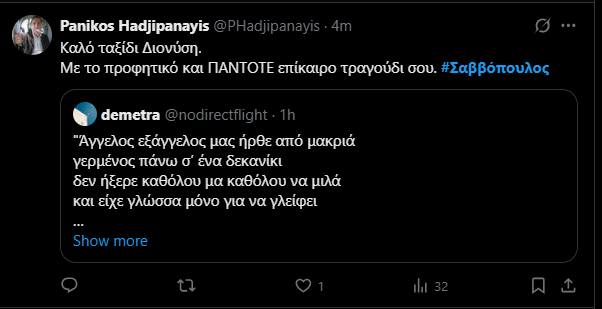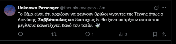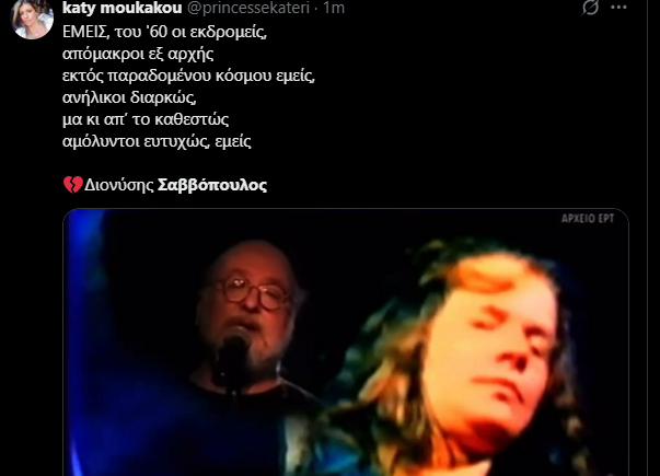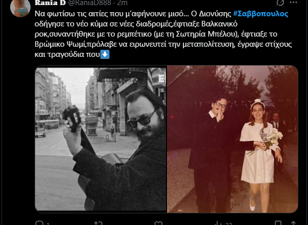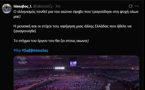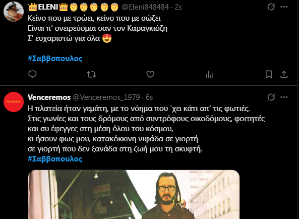 Στο Χ αλλά και γενικότερα στα social media υπήρξαν εκατοντάδες αναρτήσεις για τον σπουδαίο Σαββόπουλο. Όλοι και όλες έκαναν αναρτήσεις, με έναν διαφορετικό στίχο από τα τραγούδια του, που χαρακτήρισαν μία συγκεκριμένη φάση της ζωής τους. Γιατί ο Σαββόπουλος κατάφερε να δημιουργήσει τραγούδια που έγινε βίωμα μας.