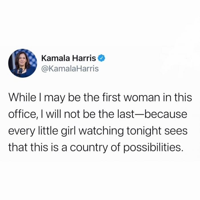Η Harris έμαθε τα νέα την ώρα που έκανε jogging στο πάρκο, όπου και πήρε τηλέφωνο τον Biden για να του πει πως τα κατάφεραν. Το βίντεο αυτό φυσικά έγινε viral και λίγο αργότερα η Kamala έγραψε στο Twitter: «Λοιπόν μπορεί να είμαι η πρώτη γυναίκα μέσα σε αυτό το γραφείο, δεν θα είμαι όμως η τελευταία. Και αυτό γιατί κάθε μικρό κορίτσι που μας βλέπει απόψε, βλέπει πως αυτή είναι μια χώρα με πιθανότητες».