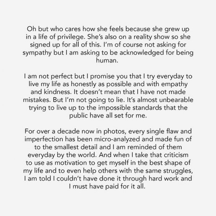 «Γεια παιδιά, αυτή είμαι εγώ και το σώμα μου αρετουσάριστο και άφιλτρο. Η φωτογραφία που ανέβηκε αυτήν την εβδομάδα ήταν όμορφη. Αλλά ούσα κάποια που παλεύει με την εικόνα του σώματός της μια ολόκληρη ζωή, όταν κάποιος βγάζει μια φωτογραφία που δεν σε κολακεύει με κακό φωτισμό ή δεν δείχνει το σώμα σου όπως πραγματικά είναι μετά την τόση γυμναστική, και μετά τη μοιράζεται με τον κόσμο, έχεις κάθε δικαίωμα να ζητήσεις την απόσυρσή της, ανεξαρτήτως του ποια είσαι.
