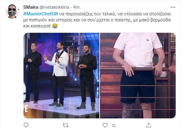 Πριν μπουν στην κυκλική κουζίνα για να κάνουν το τελευταίο μεγάλο μενού των 4 πιάτων ο Πάνος και η Καλλιόπη, είχαμε την ενθουσιώδη είσοδο όλων των υπόλοιπων παικτών. Οι κριτές τους υποδέχτηκαν με σμόκιν και παπιγιόν αλλά οι παίκτες όχι μόνο δεν ακολούθησαν το αντίστοιχο dress code, αλλά μερικοί όπως ο Μάριος πήγαν με βερμούδα, σα να πήγαιναν βόλτα στην παραλία. Μόνο τα κορίτσια όπως η Ελισάβετ και η Ελπίδα ήταν κομψότατες, ενώ ακολούθησαν στην σικ επιλογή και οι μαμάδες των υποψηφίων. Και έτσι ήταν το σωστό.
