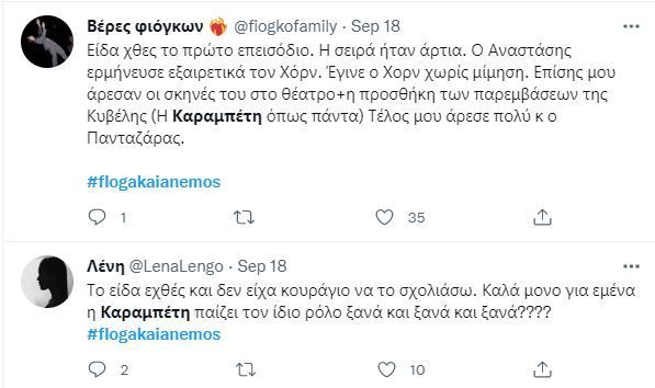 Μία ακόμη σειρά εποχής το «Φλόγα και άνεμος» στη ΕΡΤ, κάνει φέτος την έκπληξη και παρά το ιδιαίτερο θέμα του, το καστ με ταλαντούχους και πασίγνωστους σε εμάς ηθοποιούς κράτησε και στο δεύτερο επεισόδιο αμείωτο το ενδιαφέρον των τηλεθεατών. Η Καρυοφυλλιά Καραμπέτη είχε χθες την τιμητική της στα σχόλια των χρηστών του Twitter, όπως όμως και ο Αργύρης Πανταζάρας, η Πέγκυ Τρικαλιώτη και η Λένα Παπαληγούρα.