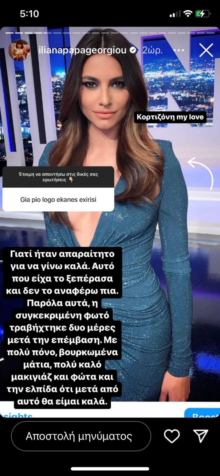 «Γιατί ήταν απαραίτητο για να γίνω καλά. Αυτό που είχα το ξεπέρασα και δεν το αναφέρω πια. Παρόλα αυτά. Η συγκεκριμένη φώτο τραβήχτηκε δύο ημέρες μετά την επέμβαση. Με πολύ πόνο, βουρκωμένα μάτια, πολύ καλό μακιγιάζ και φώτα και ελπίδα ότι μετά από αυτό θα είμαι καλά. Μόνο οι συνεργάτες μου στο καμαρίνι και η Έλενα… Πήγαινα στη θέση μου νωρίτερα για να με βοηθήσουν να καθίσω και έφευγα τελευταία για να μη δει κανείς ότι δεν μπορώ να σηκωθώ. Ήμουν τόσο ευγνώμων για τη δουλειά μου, ήθελα να φαίνομαι πάντα τέλεια», είπε η Ηλιάνα.
