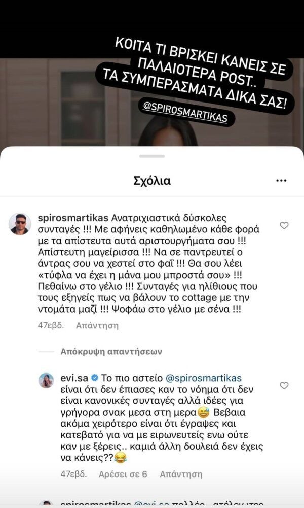 «Το πιο αστείο είναι ότι δεν έπιασες καν το νόημα ότι δεν είναι κανονικές συνταγές αλλά ιδέες για γρήγορα σνακ μέσα στην ημέρα. Βέβαια, ακόμα χειρότερο είναι ότι έγραψες κατεβατό για να με ειρωνευτείς ενώ ούτε καν με ξέρεις. Καμία άλλη δουλειά δεν έχεις να κάνεις;».