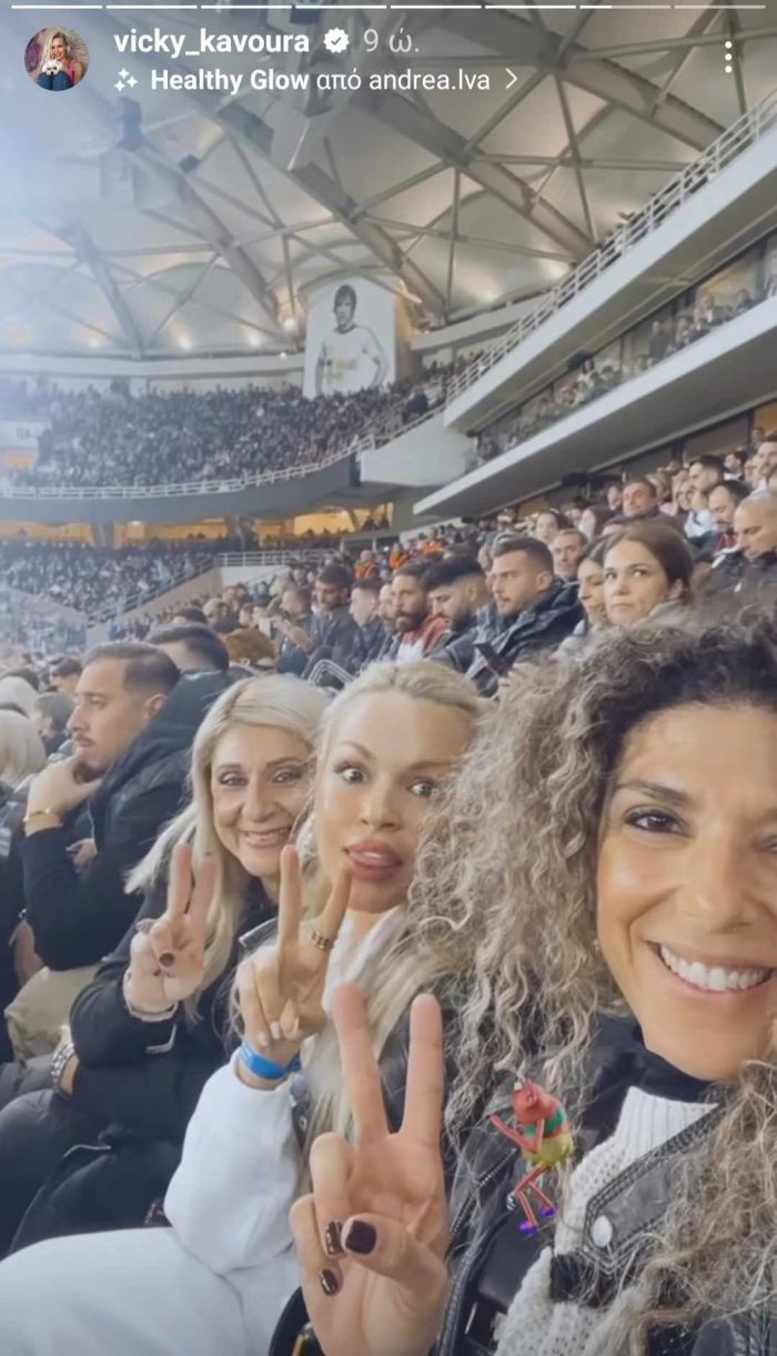 Στο γήπεδο βέβαια, βρέθηκε όπως κάνει σε κάθε αγώνα και η Βίκυ Κάβουρα, για να στηρίξει τον σύντροφό της, τον Γιώργο Τζαβέλλα. Η ηθοποιός έβγαλε μάλιστα φωτογραφία και με τον αδερφό του ποδοσφαιριστή, τον Παναγιώτη Τζαβέλλα, πράγμα που δείχνει πως η ίδια έχει πολύ καλές σχέσεις και με την οικογένειά του.