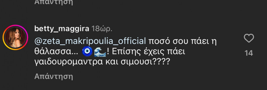 Όπως ήταν λογικό, η παρουσιάστρια του ΑΝΤ1 εκθειάστηκε. Ανάμεσα στα σχόλιο που ξεχώρισαν και εκείνο της Μπέτυς Μαγγίρα η οποία πολύ εύστοχα είπε στη Ζέτα «πόσο σου πάει η θάλασσα».