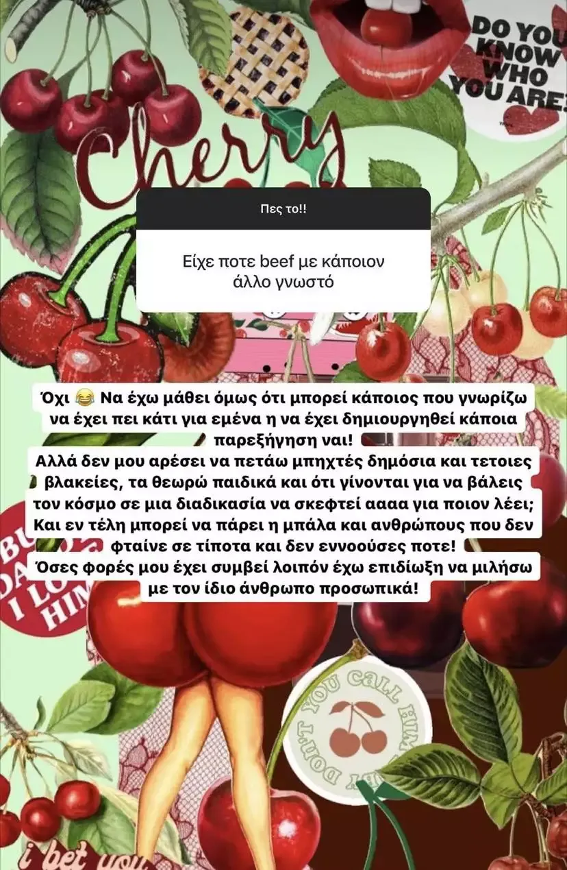 Λίγο αργότερα η πρώην παίκτρια του GNTM εξήγησε στο κοινό της γιατί προτιμά να λύνει τυχόν παρεξηγήσεις ιδιωτικά, αποφεύγοντας κάθε είδους beef ή τσακωμό.