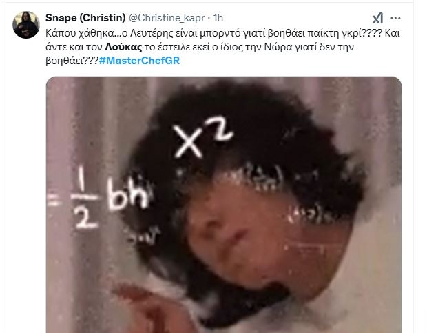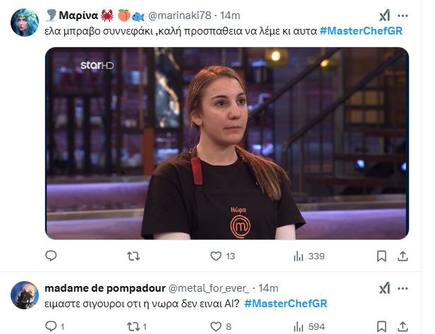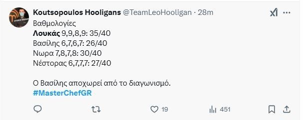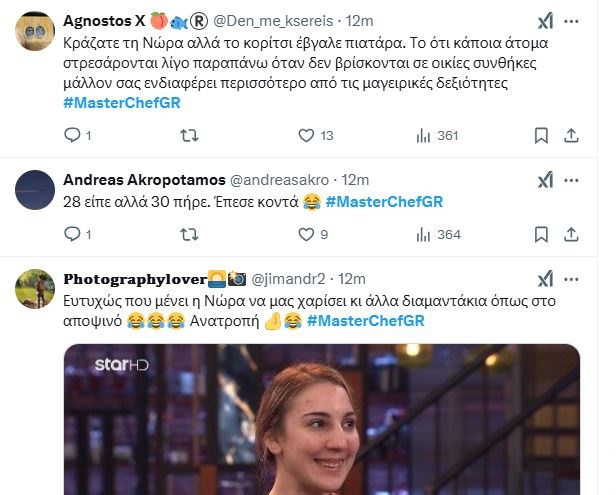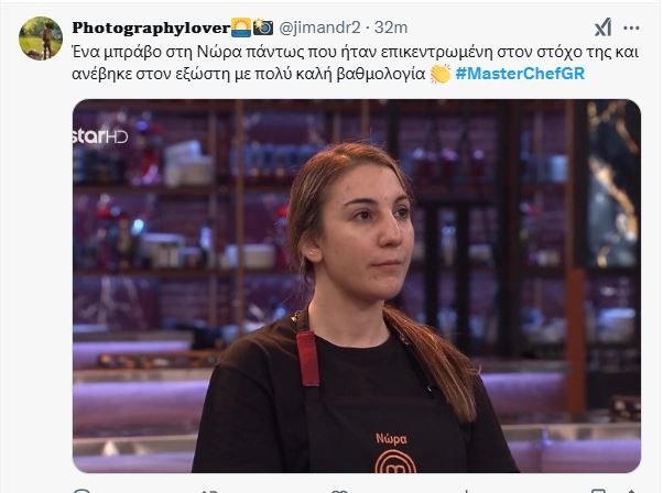 Μόνο εκείνος πλησίασε οπτικά και γευστικά το συγκεκριμένο πιάτο και ήρθε πρώτος στη βαθμολογία, ενώ έκπληξη ήταν η απόδοση της Νώρας. Η παίκτρια από το άγχος της όταν ρωτήθηκε από τους συμπαίκτες της να πει έναν αριθμό από το 1 έως το 4 για να αφήσει το τελικό της πιάτο, είπε το 28 και ακούστηκαν αρκετές ειρωνείες από τον εξώστη. Αυτό έφερε όμως και τη συμπαράσταση του Χ.