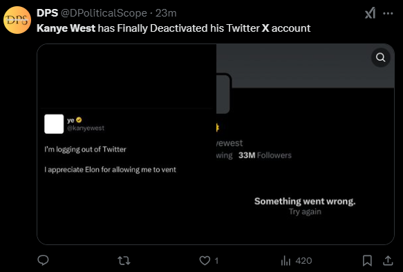 Οι χρήστες του Χ παρατήρησαν την αποχώρηση του Kanye West από το Χ και δε μπόρεσαν παρά να το σχολιάσουν, με πολλούς βέβαια να αναρωτιούνται αν τελικά αποχώρησε ο ίδιος οικειοθελώς ή ήταν ο Elon Musk που έσβησε τον λογαριασμό του. Αυτό, λοιπόν, δεν έχει διευκρινιστεί ακόμα.