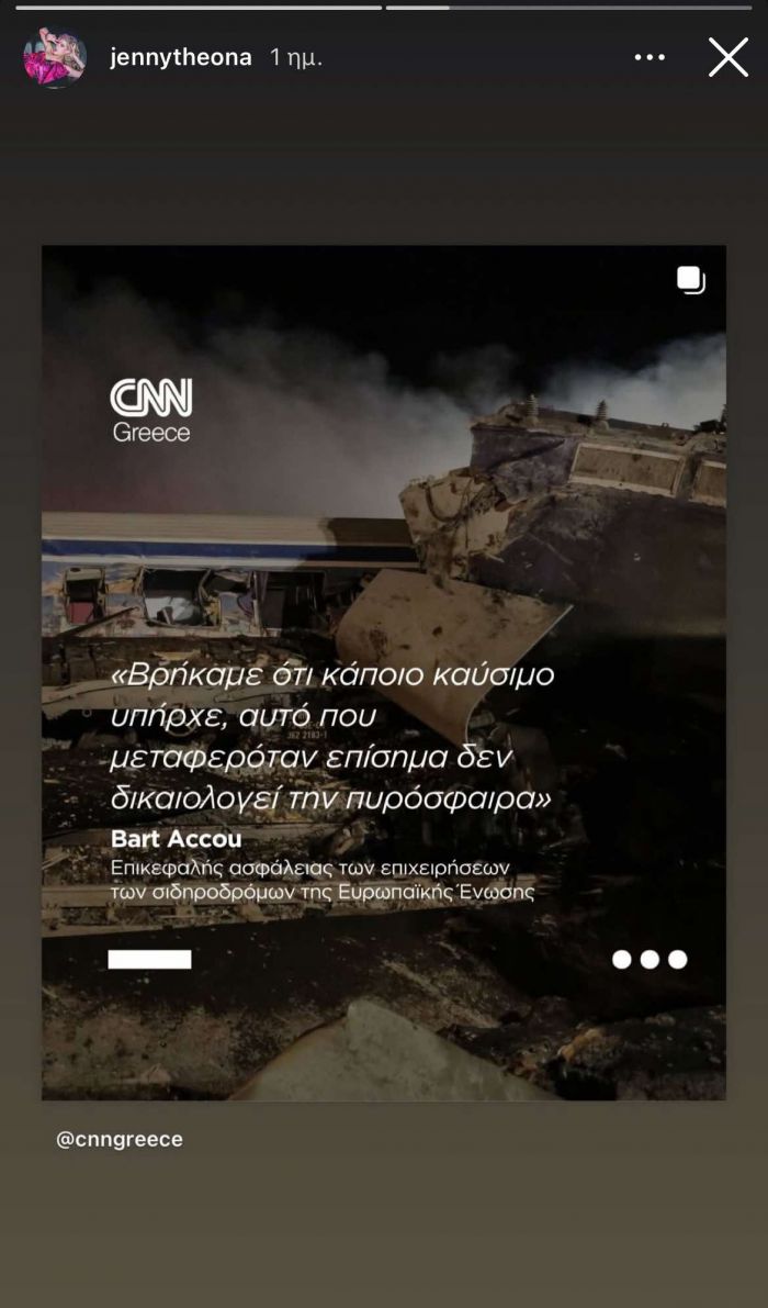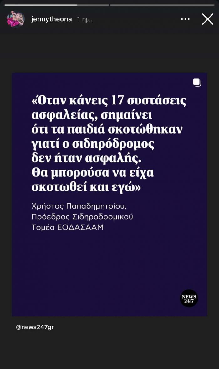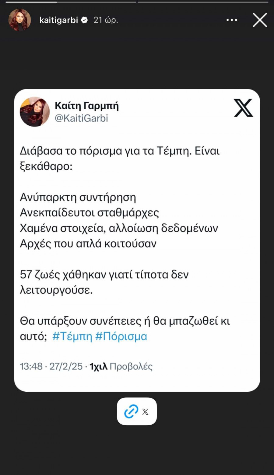 ενώ η Καίτη Γαρμπή από το βράδυ είχε κάνει μια ανάρτηση για τα Τέμπη μετά και το πόρισμα του Εθνικού Οργανισμού Διερεύνησης Αεροπορικών και Σιδηροδρομικών Ατυχημάτων και Ασφάλειας Μεταφορών (ΕΟΔΑΣΑΑΜ), γράφοντας: