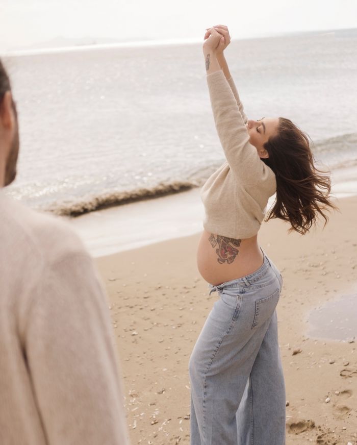 Φορώντας μπεζ πουλόβερ και οι δύο με μπλε τζιν και κάνοντας βόλτα στο μέρος που αγαπούν πολύ, τη θάλασσα, η Ευρυδίκη Βαλαβάνη και ο πρώην ντράμερ και νυν σύμβουλος ψυχικής υγείας πόζαραν αγκαλιά με τη φουσκωμένη της κοιλιά να είναι αυτή που κλέβει την παράσταση.