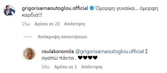 «Όμορφη γυναίκα, όμορφη καρδιά», γράφει ο Γρηγόρης, «Σ' αγαπώ πάντα», απαντά η Ρούλα! Η σχέση των δύο παρουσιαστών παραμένει ζεστή και γεμάτη αγάπη ακόμη και σήμερα, λοιπόν και δεν διστάζουν να το μοιραστούν και δημόσια.