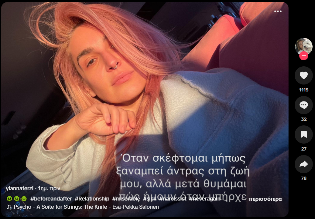 Στον λογαριασμό της στο TikTok, η Γιάννα Τερζή δημοσίευσε δύο φωτογραφίες. Στην πρώτη έδειξε τον εαυτό της τώρα, γράφοντας «Όταν σκέφτομαι μήπως ξαναμπεί άντρας στη ζωή μου, αλλά μετά θυμάμαι πώς ήμουν όταν υπήρχε», ενώ στη δεύτερη μας άφησε να ρίξουμε μια ματιά στην κατάσταση στην οποία βρισκόταν όταν είχε σχέση. Χωρίς να πει τίποτα παραπάνω για τη δεύτερη εικόνα, η Γιάννα Τερζή άφησε να εννοηθεί πως όταν βρισκόταν σε σχέση δεν ήταν καλά και κυρίως δεν ήταν ο εαυτός της, κάτι που μπορούμε να διακρίνουμε εμφανώς από αυτή τη φωτογραφία και τα συναισθήματα που εκφράζει.