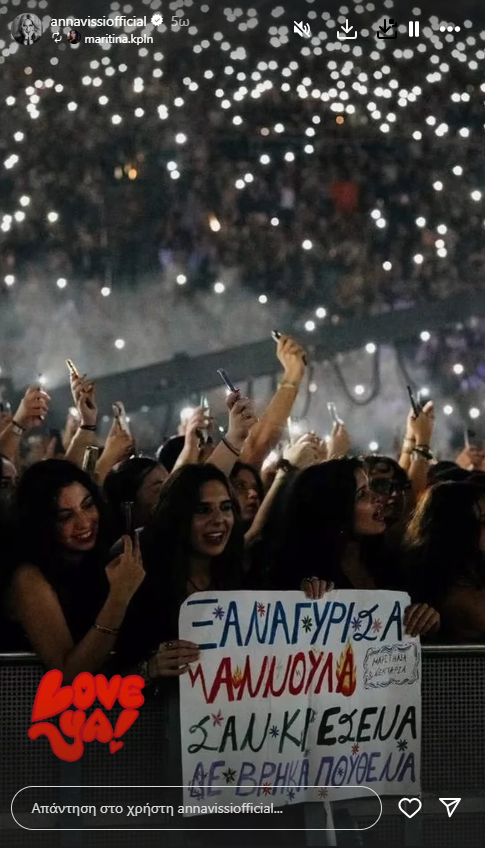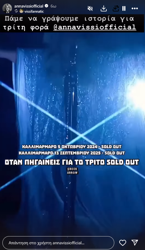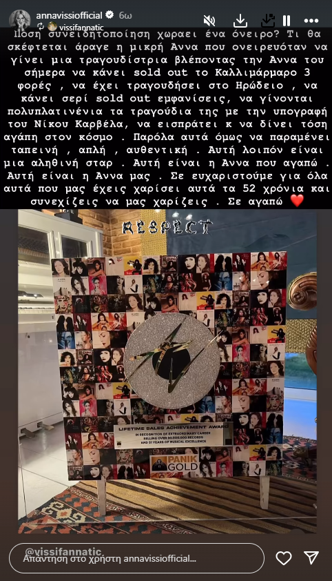 Με αφορμή τις εμφανίσεις της στο Καλλιμάρμαρο και την πρώτη συναυλία που έγινε πολύ γρήγορα sold out, η Άννα Βίσση έκανε ένα Insta Story, εκφράζοντας στους θαυμαστές της την ευγνωμοσύνη της για τη στήριξη που της δείχνουν όλα αυτά τα χρόνια. Η αγαπημένη τραγουδίστρια έχει μια σχέση με τη μουσική για πάνω από 50 χρόνια και η ανάρτησή της συγκινεί.
