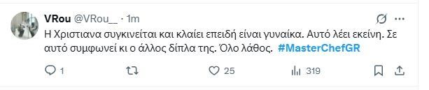 Σε ένα one woman show εξελίχθηκε ξανά το MasterChef γιατί το 60% τουλάχιστον του τηλεοπτικού χρόνου καταλήφθηκε πάλι από τις δηλώσεις και τις αγωνίες της Χριστιάννας στη διαδικασία αποχώρησης.