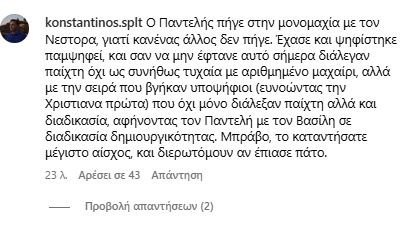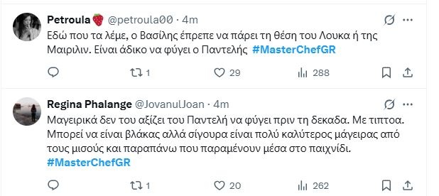 Και τελευταίος έμεινε ο Παντελής που έμενε να διαγωνιστεί με τον Βασίλη. Άδικη αυτή η δοκιμασία για τον Παντελή, έναν από τους καλύτερους σεφ του διαγωνισμού. Που είχε γνώσεις. Που ήξερε τι έκανε και δεν ήταν απλά παίκτης για να εξυπηρετήσει το reality, όπως η 4αδα της Χριστιάννας, Μαίρυλιν, Μάριου και Λούκα.
