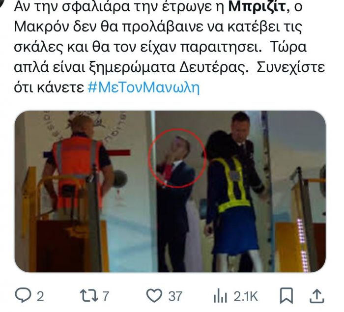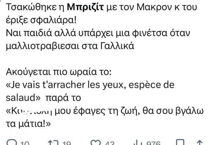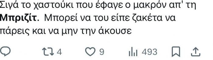 Η έντονη αυτή στιγμή ανάμεσα στο ζευγάρι δεν διέφυγε της προσοχής και του ελληνικού X με τα σχόλια να είναι πολλά και το #Μπριζίτ και #Μακρόν να είναι στην 3άδα των trends.