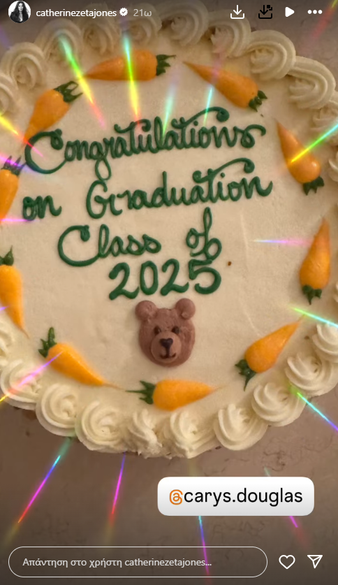 Η ηθοποιός μοιράστηκε περισσότερες στιγμές από τον εορτασμό μέσω Instagram Stories, ανεβάζοντας φωτογραφίες από μια τούρτα διακοσμημένη με το μήνυμα: «Congratulations Graduation Class of 25», καθώς και ένα στιγμιότυπο της Carys με συμμαθητές της στα σκαλιά του φημισμένου Ivy League πανεπιστημίου στο Providence, Rhode Island.