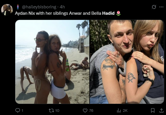 Η Gigi και η Bella Hadid εξήγησαν μέσα από τη δήλωσή τους ότι η ετεροθαλής αδερφή τους, Aydan Nix, γεννήθηκε και μεγάλωσε στη Φλόριντα και στην ανατροφή της έπαιξε ρόλο «ο άνδρας που γνώριζε με αγάπη ως πατέρα της μέχρι τον ξαφνικό του θάνατο όταν ήταν 19 ετών».