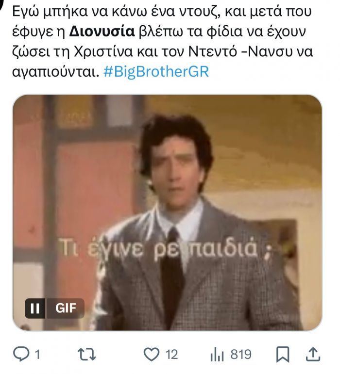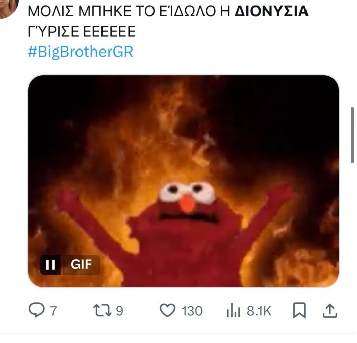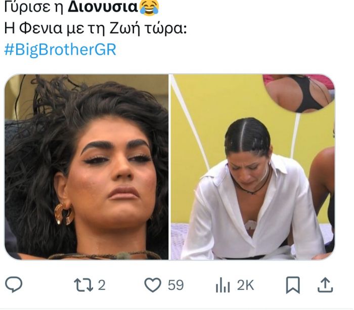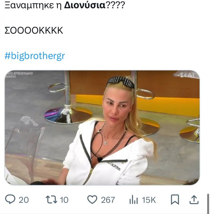 Αυτό δεν ήταν όμως, το μόνο που σχολιάστηκε στο Χ από το κοινό που παρακολουθεί το ριάλιτι, αλλά και η μεγαλειώδης είσοδος της Διονυσίας Κούκιου, η οποία απ' ότι φάνηκε πέρασε να πει ένα απλό γεια - ή και όχι καθώς περισσότερα θα δούμε στο σημερινό επεισόδιο.