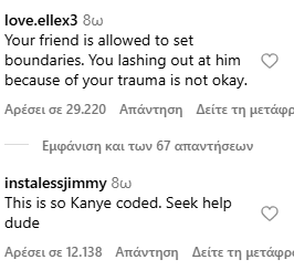 «Έχεις μεγαλώσει, Justin. Σε παρακαλώ θεραπεύσου, κανείς δεν ΠΡΕΠΕΙ να αντιμετωπίζει τα τραύματα και τον θυμό σου. ΕΣΥ πρέπει να το κάνεις για τον εαυτό σου, ώστε να μην πληγώνεις τους ανθρώπους γύρω σου που θέλουν το καλό σου», «Ένα τραυματισμένο άτομο πρέπει να αναγνωρίσει το τραύμα του και να προχωρήσει σε θεραπεία», είναι μερικά από τα σχόλια των χρηστών κάτω από την ανάρτηση του τραγουδιστή, ενώ ένας άλλος κάνει μια σύγκριση, η οποία είναι εμφανώς εύστοχη.