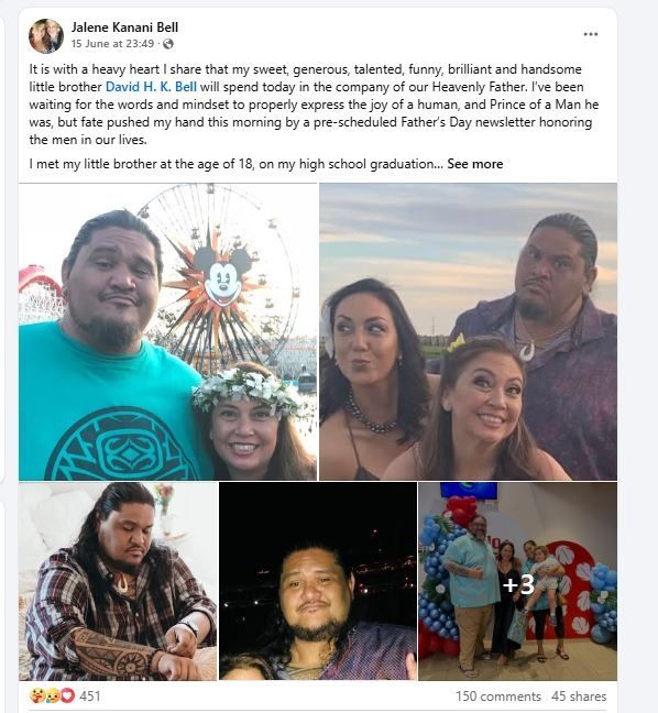 Ήταν και θα παραμείνει ένα λαμπρό και φωτεινό αστέρι. Πρόσφατα εμφανίστηκε στη μεγάλη οθόνη με μια εμβληματική σκηνή στο Lilo & Stich. Για να τον τιμήσουμε και να προσπαθήσουμε να απαλύνουμε τον πόνο μας, πήγαμε να φάμε παγωτό και ο εγγονός μου ήταν πολύ συγκινημένος. Στην θεία Gerry και την οικογένεια Kenui, μεγαλώσατε έναν καταπληκτικό άνθρωπο που έγινε ο πιο αγαπητός και υποστηρικτικός άντρας στη ζωή μου και θα είμαι για πάντα ευγνώμων. Μοιράζομαι αυτό το πένθος με την μεγαλύτερη αδελφή μου Kehau Bell και την μικρότερη αδελφή μου, Lara Leimana, που αν και δεν είναι Bell, τον αγαπούσε και τον λάτρευε σαν δικό της. Του άρεσαν τα κοινωνικά μέσα και θα μοιραστώ ξανά μερικές από τις αγαπημένες μου αναρτήσεις του, καθώς και μερικές που βλέπω για πρώτη φορά και μου ξέφυγαν, επειδή είναι πολύ αστείες και συγκινητικές.