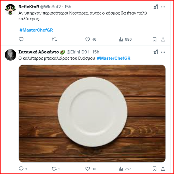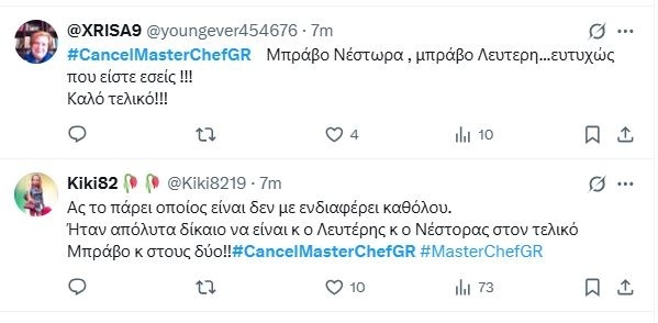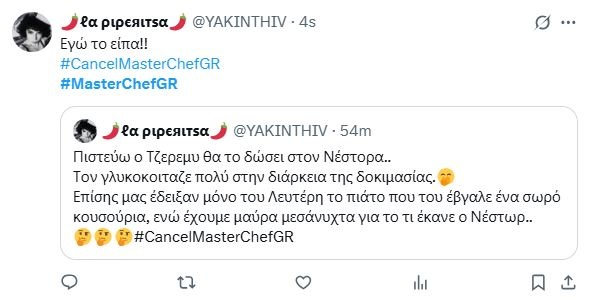 Για την ιστορία: Η βαθμολογία του Λευτέρη στη δοκιμασία του ημτελικού που μέτρησε και στον τελικό ήταν 9 βαθμοί (ο Νέστορας 7), στην 1η δοκιμασία του τελικού στην Κρήτη πήρε 4 (ο Νέστορας 3 ) στη 2η με το δικό του μενού πήρε 6 (ο Νέστορας 8) και ο Jeremy Chan του έδωσε 9 βαθμούς που του έδωσαν και τη νίκη.