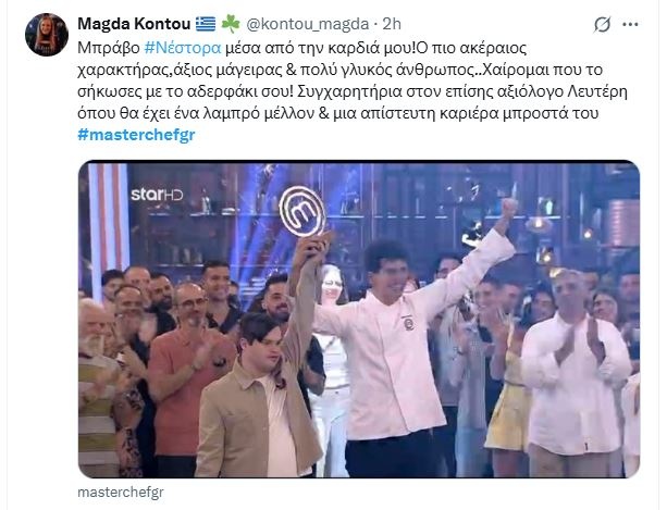 Το κοινό ενθουσιάστηκε με το αποτέλεσμα του 9ου τελικού του MasterChef, αν και το άξιζε το ίδιο και ο Λευτέρης. Η εικόνα που θα μείνει για πάντα στη μνήμη μας είναι τον Νέστορα να σηκώνει το έπαθλο με τον αδελφό του Κωνσταντίνο στον οποίο είχε υποσχεθεί να νικήσει.