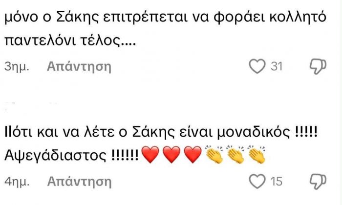 Το σίγουρο πάντως είναι -αν ανατρέξει κανείς στα σχόλια κάτω από τα viral βίντεο του Σάκη με το σκισμένο τζιν- πως ο ίδιος 33 χρόνια μετά την πρώτη του εμφάνιση έχει ακόμα πολλούς θαυμαστές κι αυτό δεν είναι τυχαίο. Οι περισσότεροι μάλιστα, παραδέχτηκαν πως είναι από τους πιο καλούς performers και αυτό κερδίζει κάθε τοξικό σχόλιο που αφορούσε το αν ήταν μικρό σε μέγεθος το τζιν ή το τι ποιότητας ήταν.