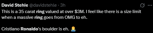 Με χιούμορ και καλή διάθεση, η γυναίκα σχολίασε: «Για να φορέσεις αυτό το διαμάντι καθημερινά, θα χρειαστείς χειρουργική επέμβαση για την αναδόμηση του δακτύλου. Φαντάσου να φοράς ένα kettlebell 100 κιλών όλη μέρα, κάθε μέρα. Πονάει, αλλά αξίζει».