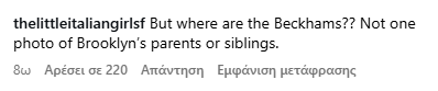 «Αλλά πού είναι οι Beckhams; Δεν υπάρχει ούτε μία φωτογραφία των γονιών ή των αδελφών του Brooklyn», αυτό ήταν που αναρωτήθηκαν πολλοί χρήστες του διαδικτύου, σχολιάζοντας τις αναρτήσεις του ζευγαριού.