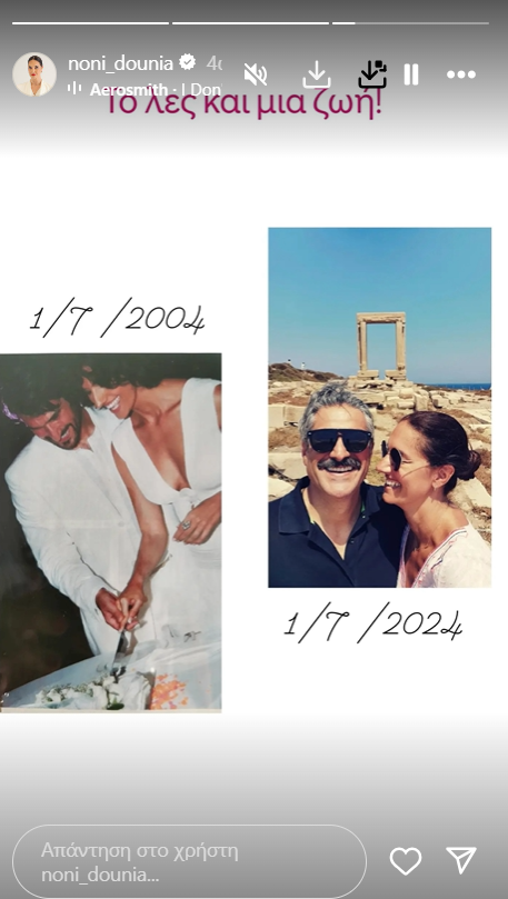 Πρόσφατα η Νόνη Δούνια και ο Κυριάκος Μουρατίδης συμπλήρωσαν 21 χρόνι παντρεμένοι και εκείνη αφιέρωσε στην κοινή τους ζωή μία τρυφερή ανάρτηση επίσης.