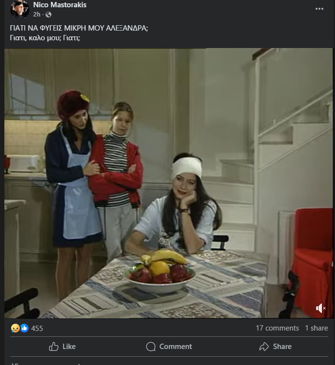 Ο Νίκος Μαστοράκης, ο άνθρωπος που της έδωσε την πρώτη της μεγάλη ευκαιρία το 1996 με το «Καληνύχτα Μαμά», αποχαιρέτησε την Αλεξάνδρα Νικολαΐδου με πίκρα και ένα τεράστια «γιατί»: «ΓΙΑΤΙ ΝΑ ΦΥΓΕΙΣ ΜΙΚΡΗ ΜΟΥ ΑΛΕΞΑΝΔΡΑ; Γιατί, καλό μου; Γιατί;». Στο απόσπασμα από το βίντεο που ανάρτησε, βλέπουμε το χαμόγελό της τότε, την αθωότητα και το φως μιας εποχής που όλα έμοιαζαν να ξεκινούν. Εκείνος πίστεψε σε εκείνη, εκείνη έγραψε το δικό της αποτύπωμα σε μια σειρά που ακόμη μνημονεύεται για την τόλμη της και το ξεχωριστό της ύφος.