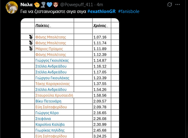 Χθες είχαμε αγώνα μεταλλίου όπου ο Μάριος Πρίαμος νίκησε από τους άντρες και η Ιωάννα από τις γυναίκες, έχοντας ατομικά πια προνόμια, ενώ ο Φάνης Μπολέτσης συνεχίζει να προηγείται στα στατιστικά που παίζουν ρόλο και στο τελικό αποτέλεσμα γενικά στο παιχνίδι.