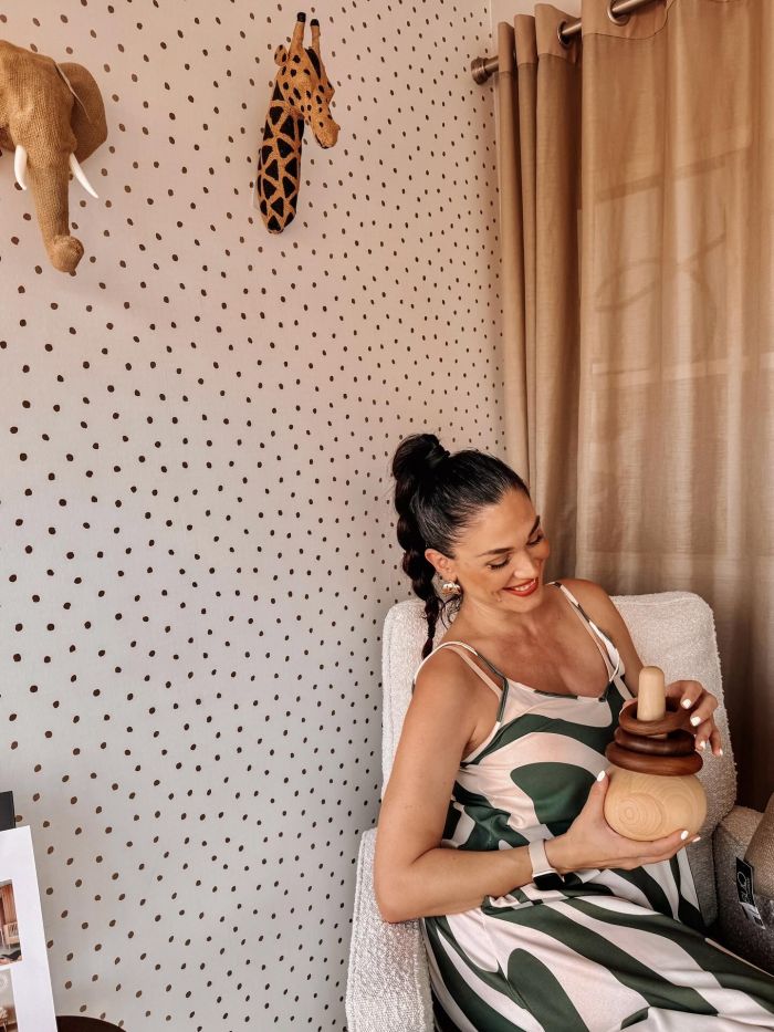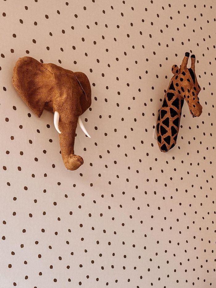 Όσο για τα περαιτέρω διακοσμητικά το κυρίαρχο στοιχείο είναι η φύση, γι' αυτό και πέρα από το χαλί σε σχέδιο ζέβρας, υπάρχουν πολλά ζωάκια και στοιχεία εμπνευσμένα από τη ζούγκλα, όπως λούτρινα κεφαλάκια ελέφαντα και καμηλοπάρδαλης στον τοίχο, καθώς και κρεμαστά παιχνίδια στην κούνια. Κάπου εκεί, στα ράφια βλέπουμε σύννεφα και αρκουδάκια, που δίνουν μια παιχνιδιάρικη, αλλά γαλήνια ατμόσφαιρα.