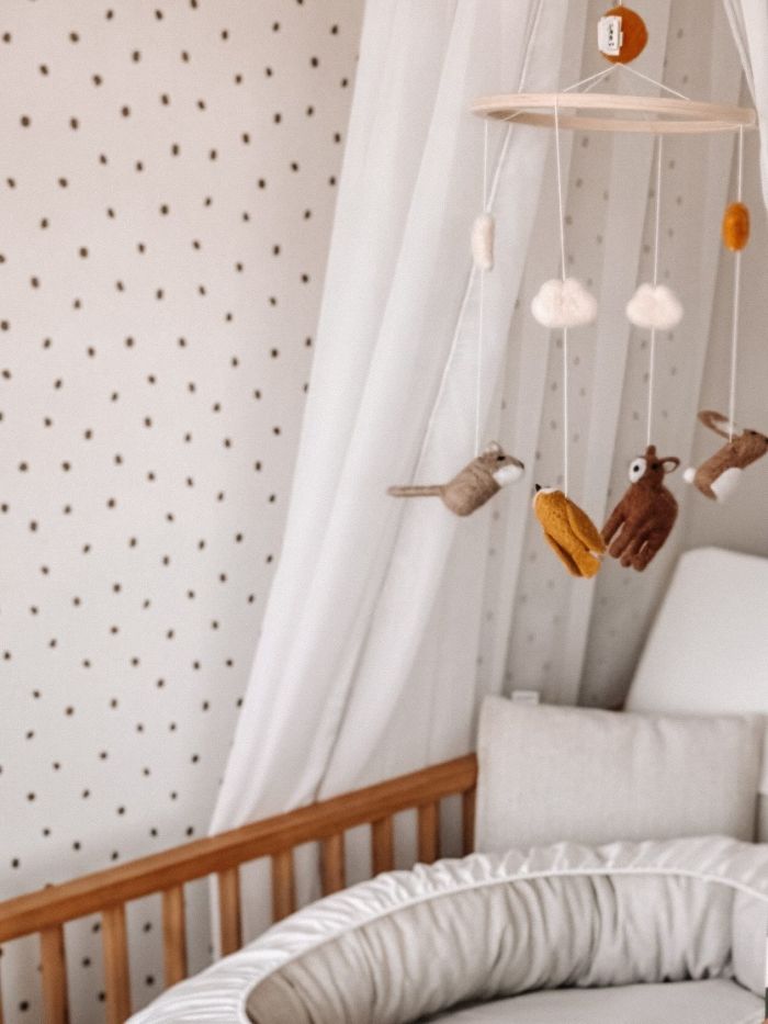 Όπως θα δεις, είναι εξοπλισμένο με ξύλινα έπιπλα σε ανοιχτή απόχρωση, αλλά και μικρά ξύλινα διακοσμητικά παιχνίδια. Οι τοίχοι είναι βαμμένοι στους απαλούς τόνους του μπεζ και λευκού, ενώ υπάρχει μια γωνιά που είναι διακοσμημένη διακριτικά με πουά. Ταυτόχρονα, οι κουρτίνες - επίσης σε μπεζ απόχρωση- ταιριάζουν απόλυτα με την ήρεμη χρωματική παλέτα που έχει επιλέξει το ζευγάρι.