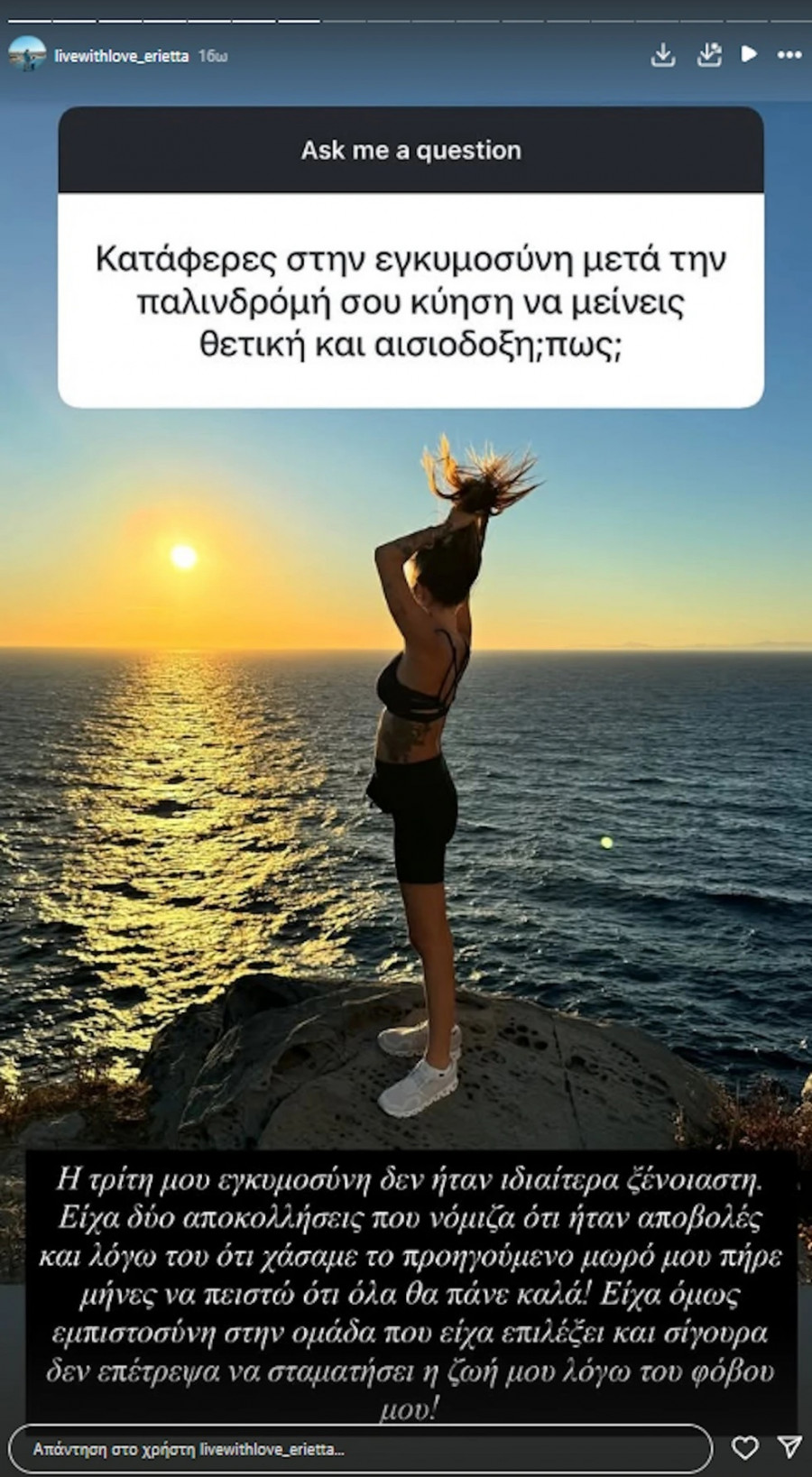 Η Εριέττα Κούρκουλου Λάτση έφερε στον κόσμο το 2ο παιδί της τον Δεκέμβριο του 2024. Ωστόσο πριν από αυτό το χαρμόσυνο γεγονός είχε προηγηθεί μια παλίνδρομη κύηση. Η ίδια απαντώντας στις followers της αποκάλυψε το πώς κατάφερε να μην χάσει την αισιοδοξία της.