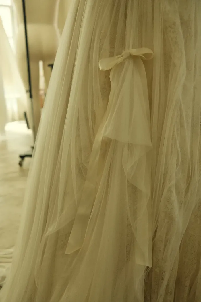 Η πιο ενδιαφέρουσα λεπτομέρεια της ημέρας όμως αφορά το ίδιο το νυφικό. Η Lana επέλεξε μια custom δημιουργία του brand Cinq από το Los Angeles, όμως η ιστορία πίσω από το φόρεμα είναι σχεδόν κινηματογραφική.
