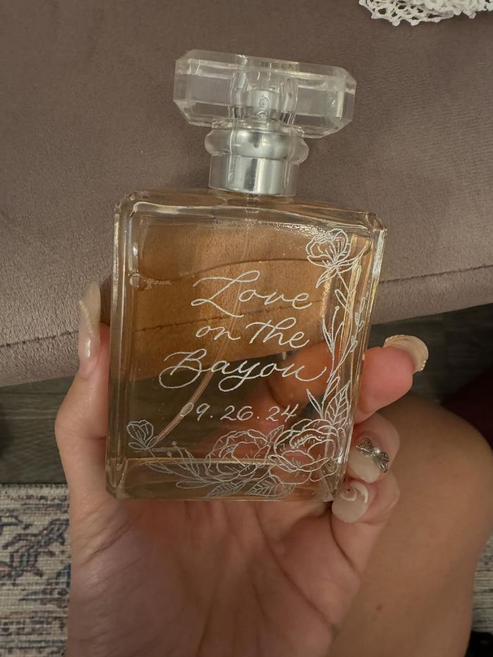 Το καρουζέλ περιελάμβανε ακόμη μια φωτογραφία ενός μπουκαλιού αρώματος χαραγμένου με τη φράση «Love on the Bayou» (έρωτας στον βάλτο) και την ημερομηνία του γάμου τους, 9.26.24, καθώς και διάφορα αντίκα ασημένια σερβίτσια.