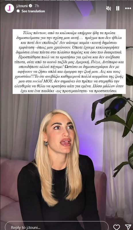 Ξέρει εμένα ως Ιωάννα, πριν γίνω διάσημη, πλούσια ή ό,τι έχω γίνει και τον σέβομαι απόλυτα και μου αρέσει να περιτριγυρίζομαι από ανθρώπους που βλέπουν την Ιωάννα και όχι την JTouni. Δεν κάναμε καμία κοινή εμφάνιση, δεν πήγαμε στο φεστιβάλ Καννών και δεν ήθελα να δημοσιοποιηθεί όλο αυτό».