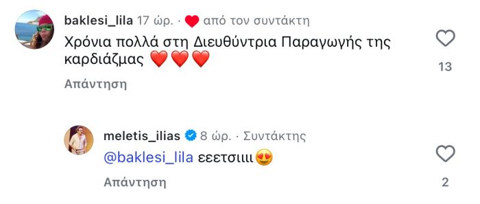 Οι συνάδελφοι του Μελέτη Ηλία, όπως και αρκετοί followers του έσπευσαν να ευχηθούν στην Κοραλένια, κάνοντας ίσως κι ένα μικρό σπόιλερ για το τι θα γίνει όταν μεγαλώσει - διευθύντρια παραγωγής, όπως την αποκάλεσε η Λίλα Μπακλέση.