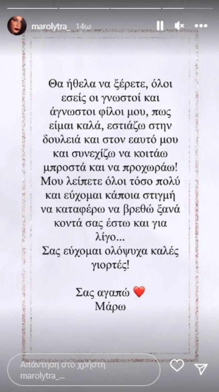 Θα ήθελα να ξέρετε όλοι, εσείς οι γνωστοί και οι άγνωστοι φίλοι μου, πως είμαι καλά εστιάζω στη δουλειά και τον εαυτό μου και συνεχίζω να κοιτάω μπροστά και να προχωράω», είχε γράψει χαρακτηριστικά.