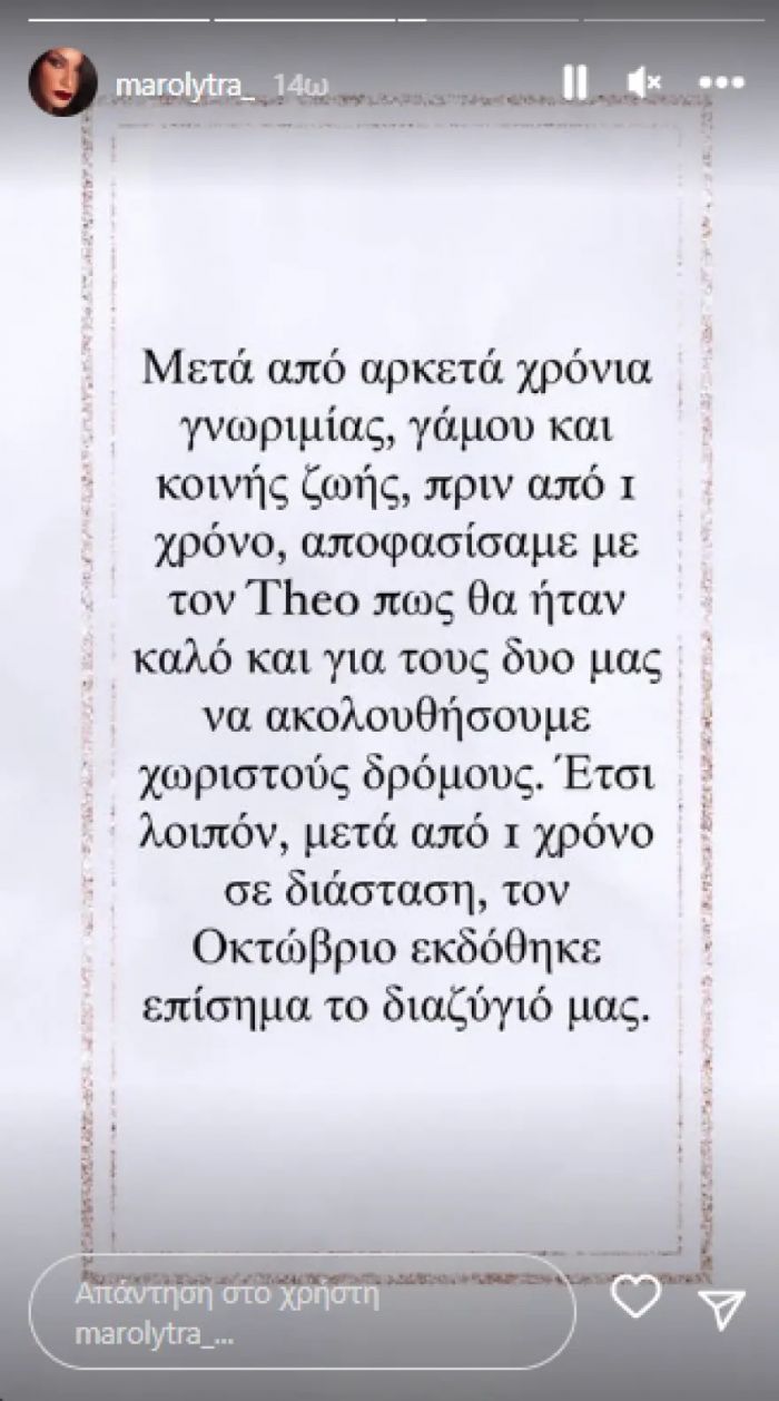 Μετά από αρκετά χρόνια γνωριμίας, γάμου και κοινής ζωής, πριν από έναν χρόνο αποφασίσαμε με τον Theo πως θα ήταν καλό και για τους δυο μας να ακολουθήσουμε χωριστούς δρόμους. Έτσι λοιπόν μετά από έναν χρόνο σε διάσταση τον Οκτώβριο εκδόθηκε επίσημα το διαζύγιό μας.