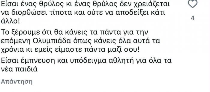 «Είσαι ένας θεός», έγραψε ο 26χρονος Ολυμπιονίκης στο άλμα επί κοντώ, με σχόλια για το πόσο «περήφανοι» είμαστε όλοι κάθε φορά που «δαμάζει» τους κρίκους - με ή χωρίς μετάλλιο - για το ότι είναι «θρύλος» στο συγκεκριμένο άθλημα και για το ότι είναι «παράδειγμα προς μίμηση» να ακολουθούν.