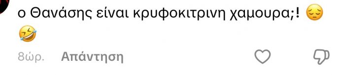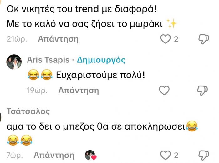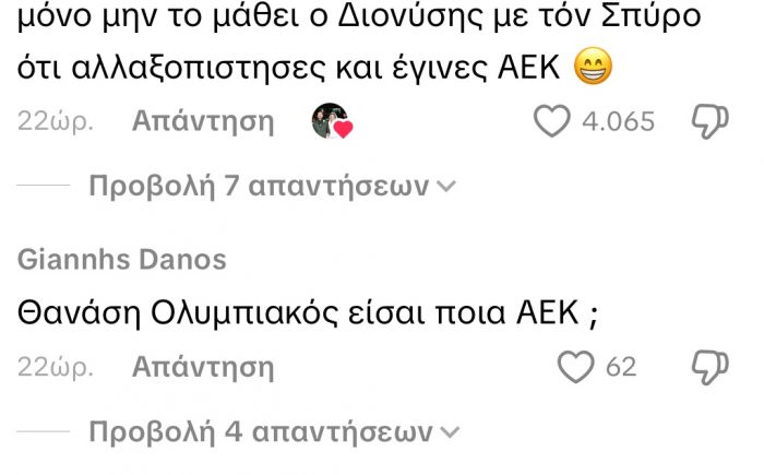 Αν και οι δυο τους με αυτό το βίντεο άνετα θα μπορούσαν να ανακηρυχθούν νικητές του συγκεκριμένου trend, οι ακόλουθοι του Άρη Τσάπη στάθηκαν σε κάτι άλλο - στο ότι ο «Θανασάκης» απαρνήθηκε την αγαπημένη ομάδα των «Μαυροτσούκαλων» και είναι ΑΕΚ αντί για Ολυμπιακός. Φυσικά λοιπόν, τα σχόλια πέρα από τις γλυκές ευχές για το νέο μέλος, είχαν και πολλή δόση χιούμορ για την «προδοσία» του Άρη Τσάπη.