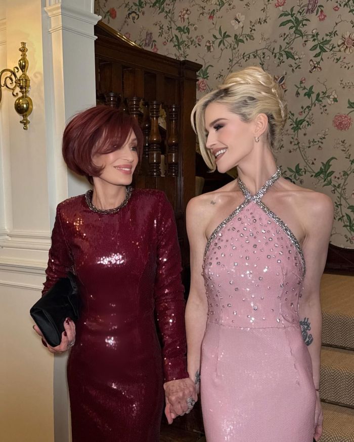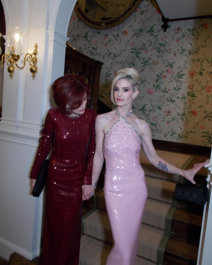 Η Sharon εμφανίστηκε σε ένα εντυπωσιακό, floor-length φόρεμα με βαθύ μπορντό παγιέτα. Η διακριτική λάμψη του υφάσματος αγκάλιαζε τη σιλουέτα της, ενώ τα χαρακτηριστικά κόκκινα μαλλιά της, συμπλήρωναν το look της με διαχρονική γοητεία. Το μαύρο clutch και τα λιτά κοσμήματα πρόσθεσαν την απαραίτητη ισορροπία, δημιουργώντας ένα σύνολο που έδειχνε κομψό, αλλά και βαθιά σεμνό, όπως ταίριαζε στη στιγμή. Δίπλα της, η Kelly Osbourne έλαμπε στο ροζ halter gown φόρεμά της με τις ασημένιες λεπτομέρειες.
