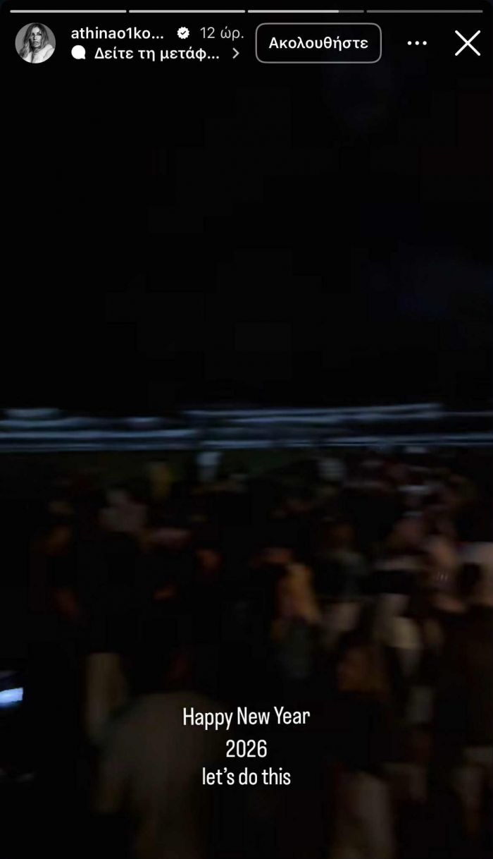 «Πρώτο story για το 2026, χρόνια πολλά συμπεθέρα μου! Υγεία πάνω απ’ όλα, τύχη, αγάπη, όλα τα καλά του κόσμου. Να διώξουμε τους τοξικούς ανθρώπους απ’ τη ζωή μας, να βρούμε την υγειά μας. Δεν μπορούσα να βγάλω άλλο στόρι γιατί ήμουνα για φαγητό… Δεν μπορούσα να βγάλω σε εκείνο το τραπέζι, ντρεπόμουν… Και να δώσω ένα μεγάλο φιλί, να περάσετε τέλεια ό,τι κι αν κάνετε σήμερα. Και η χρονιά είναι δική μας, να διεκδικήσουμε τους στόχους μας. Θα τα πούμε και το πρωί βέβαια τώρα, γιατί θα πιω τα ποτά μου τώρα. Σας αγαπώ, φιλάκια», είπε η ίδια στο πρώτο της story για το 2026 και πρόσθεσε πως ήταν σε οικογενειακό δείπνο στο σπίτι του αγοριού της.