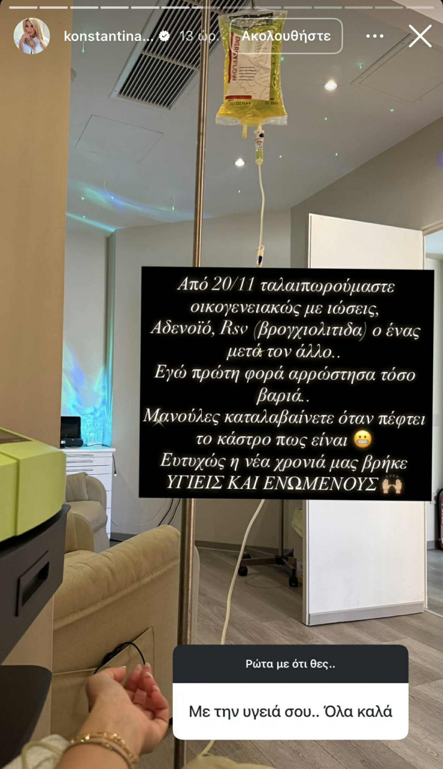 «Από 20 Νοεμβρίου ταλαιπωρούμαστε οικογενειακώς με ιώσεις. Αδενοϊό, RVS (βρογχιολίτιδα) ο ένας μετά τον άλλον… Εγώ πρώτη φορά αρρώστησα τόσο βαριά. Μανούλες καταλαβαίνετε όταν πέφτει το κάστρο πώς είναι. Ευτυχώς η νέα χρονιά μας βρήκε υγιείς και ενωμένους», έγραψε η ίδια.