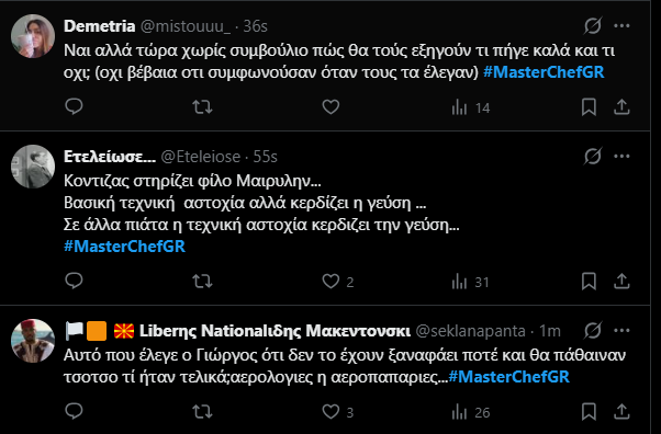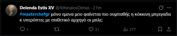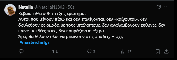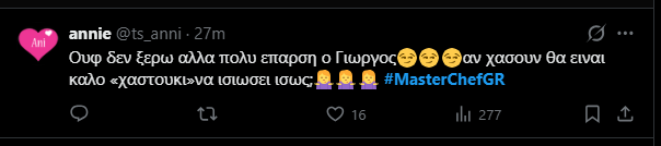 Πάντως στο Χ τα περισσότερα σχόλια αφορούσαν τον Γιώργο και αρχηγό των μπλε. Ο επιστήθιος φίλος της Μαίρυλιν, έχει μεγάλη αυτοπεποίθηση και πλήρη συναίσθηση του reality χαρακτήρα του διαγωνισμού. Έχει έτοιμες ατάκες, την κατάλληλη έπαρση και έκανε και την πρώτη επίθεση προς τους κόκκινους για την άγνοια σε κάποιες παρασκευές.